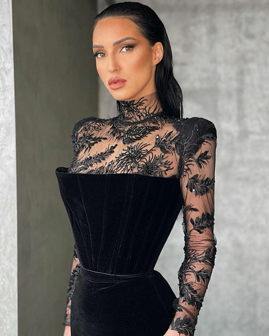 High Neck Long Sleeve Side Split Lace Mermaid Evening Dress
