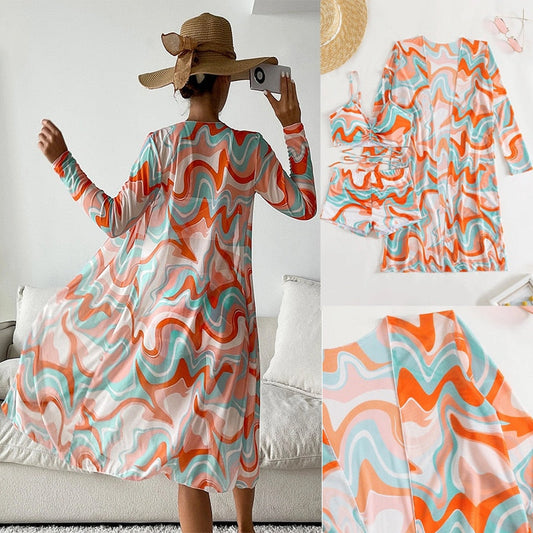 Print Swimwear Beach Skirt Bathing Suit 3 Pieces Set