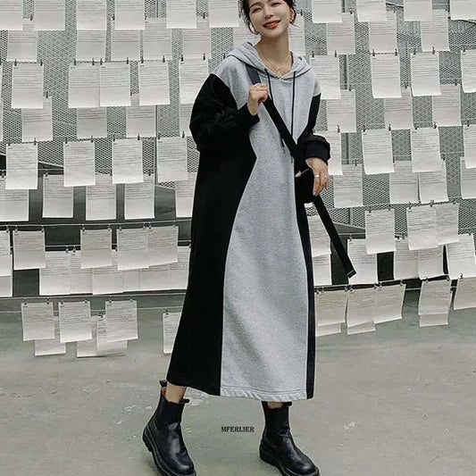 Hooded Long Loose Patchwork Sweatshirt Dress