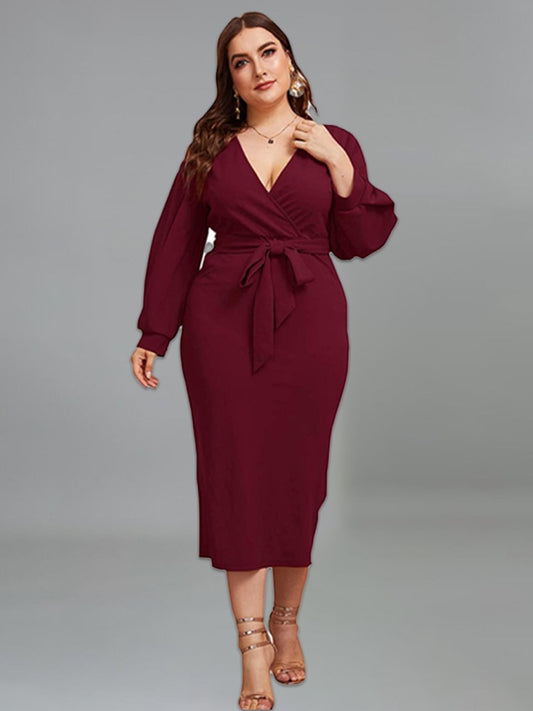 Elegant Long Sleeve Plus Size Deep V Lace Up Midi Bodycon - Plus Size Dress