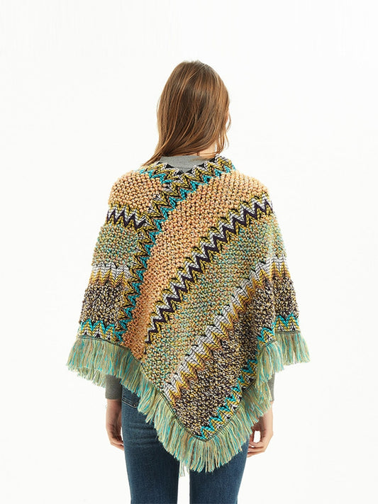 Tassel Cape Coat Fringe Poncho Oblique Stripe Coat Bohemian Shawl Scarf