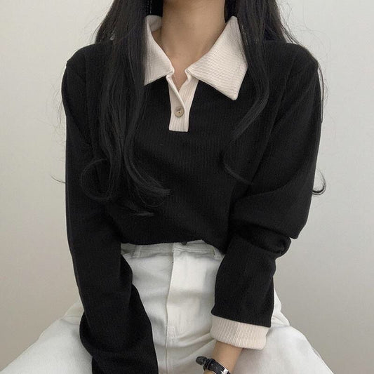 Patchwork Simple Design Turn Down Collar Sweatshirt