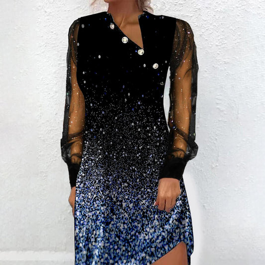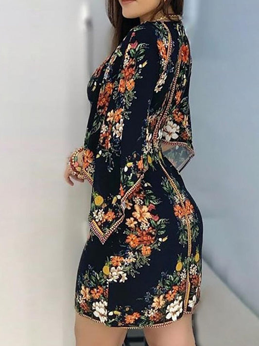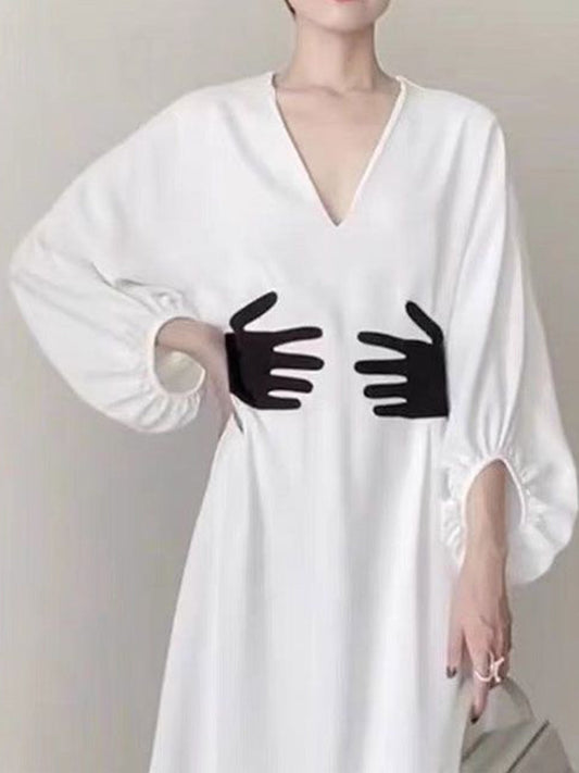 Spring New Fashion High Waist Hand Graphic Print V neck Long Sleeve Dress