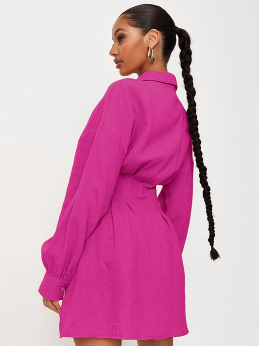 Striped Button Design Puffed Sleeve Shirt Spring Dress
