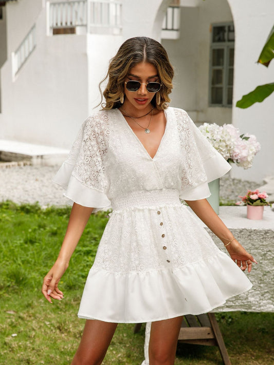 New Puff Short Sleeve Square Neck Tie Front High Split Spring Dress