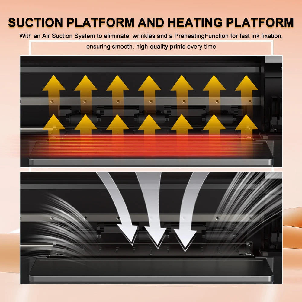 :With an Air Suction System to eliminate wrinkles and a PreheatingFunction for fast ink fixation,