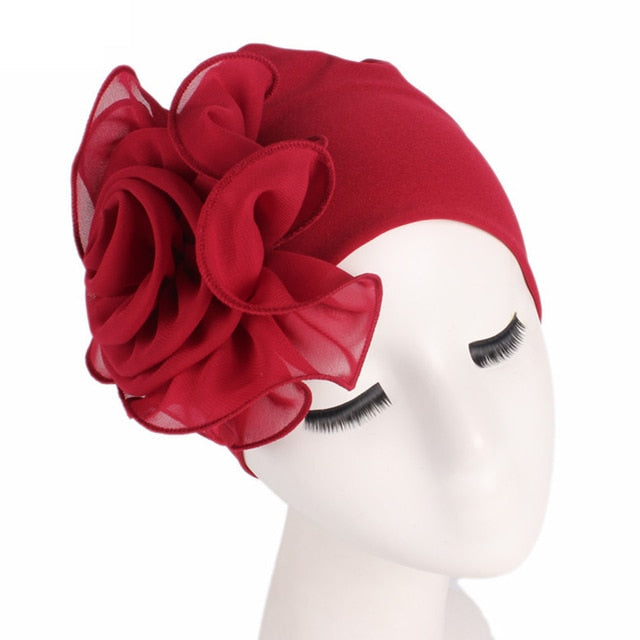 Stretch Beanies With Big Flower Hair Loss Cap Chemo Hat Hijab Turban Head Wrap