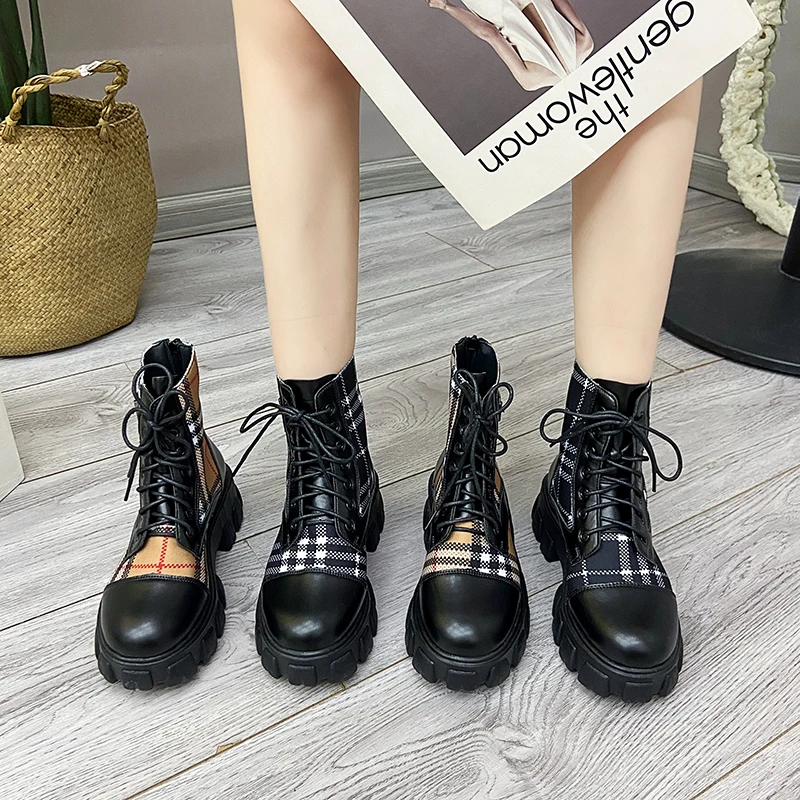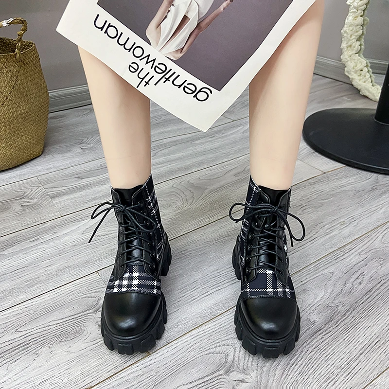 Motorcycle Boots Chunky Heels Casual Lacing Round Toe Platform Boots Shoes for Women