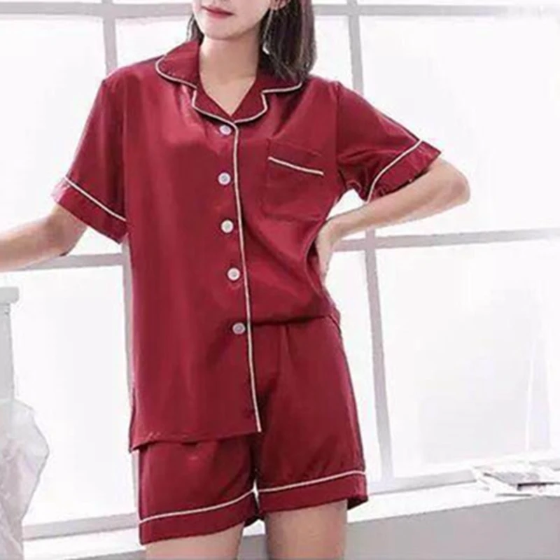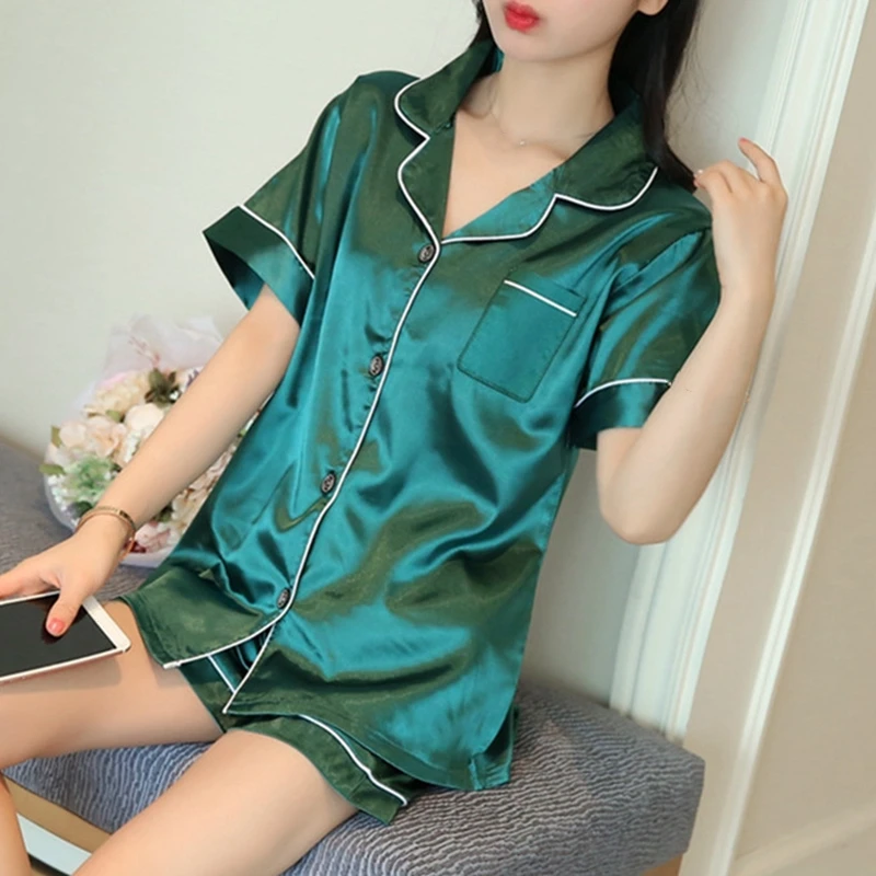 Pajamas Set Satin Silk Sleepwear Turn-down Collar 2 Pieces