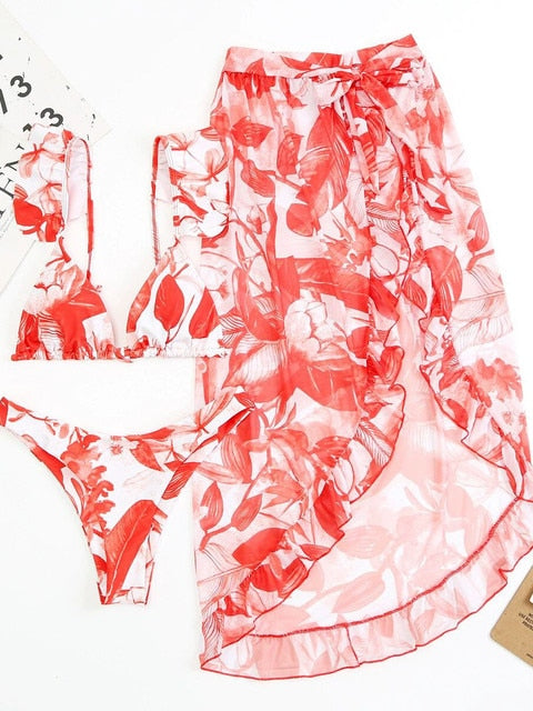 Print Swimwear Beach Skirt Bathing Suit 3 Pieces Set